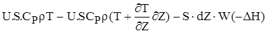 Тут перший та другий доданок враховують прихід і видаток тепла з конв'єктивним струмом у виділений елементарний об'єм; третій - тепловіділення за рахунок хімічної реакції, четвертий-відвід(підвід) тепла з теплоносiєм. Права частина - накопичення тепла. Вважаючи, що СP і r - незмінні у всьому обсязі реактора і спростивши цю залежність,одержимо остаточний вигляд енергетичого балансу для РІВ: