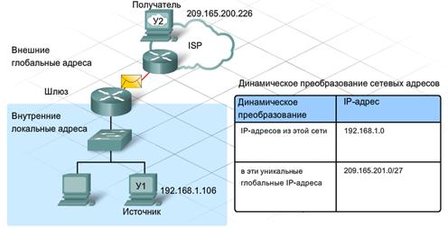 Внутренняя локальная сеть относится к любой подключенной к маршрутизатору сети, которая является частью локально адресуемой ЛВС. Узлы внутренних сетей имеют свои IP-адреса, преобразуемые перед передачей внешним пунктам назначения. Внешняя глобальная сеть — любая сеть, подключенная к маршрутизатору, которая является внешней по отношению к локальной сети и не допускает частных адресов, присвоенных узлам в локальной сети. Внутренний локальный адрес — частный IP-адрес, настроенный на узле во внутренней сети. Этот адрес должен быть преобразован, прежде чем он покинет адресную структуру локальной сети. Внутренний глобальный адрес — IP-адрес внутреннего узла, доступный для маршрутизации во внешней сети. Это преобразованный IP-адрес. Внешний локальный адрес — адрес получателя пакета, пока он находится в локальной сети. Обычно этот адрес совпадает с внешним глобальным адресом. Внешний глобальный адрес — публичный IP-адрес внешнего узла. Этот адрес выделяется из пространства глобальных маршрутизируемых сетевых адресов. Адреса могут присваиваться динамически. Динамическое преобразование сетевых адресов позволяет узлам в частной сети, имеющим частные IP-адреса, подключаться к публичной сети, например, сети Интернет. Динамическое преобразование сетевых адресов происходит тогда, когда маршрутизатор присваивает внешний глобальный адрес из предварительно определенного адреса или пула адресов внутреннему устройству частной сети.