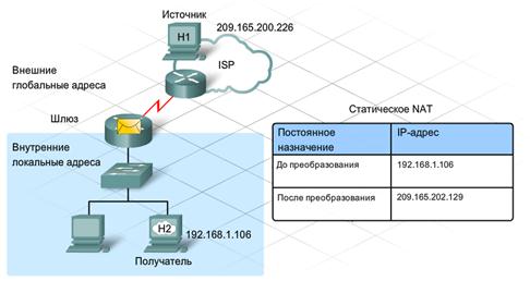 Один из способов обеспечения доступа к локальному узлу из Интернета состоит в том, чтобы присвоить этому устройству статическое преобразование адреса. Статические преобразования гарантируют, что частный IP-адрес отдельного узла будет всегда преобразовываться в один и тот же зарегистрированный глобальный адрес. Это означает, что никакой другой локальный узел не получит тот же самый зарегистрированный адрес.