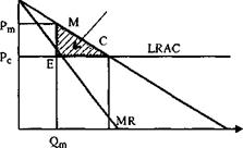 LRMC Рис. 3.3 Чистые потери от монопольной власти при условии постоянной отдачи от масштаба в долгосрочном периоде и равенства долгосрочных средних издержек монополиста и фирм на рынке совершенной конкуренции Вспомним, как отражаются эти потери в рамках модели частичного равновесия. Рассмотрим функцию спроса, которая не зависит от того, существует ли на рынке совершенная конкуренция или действует монополист. Обратим внимание, что эта предпосылка предполагает полное отсутствие заменителей товара, производимого монополистом. Если бы в отрасли была свободная конкуренция, то объем выпуска отрасли достиг бы значения Qc - величины, соответствующей условию равенства цены предельным издержкам. В условиях монополии объем производства в отрасли соответствует значению Qm - такому, когда предельная выручка монополиста равна его предельным издержкам (рис. 3.2). Выше мы вспомнили, что предельная выручка монополиста при любом объеме продаж ниже цены, следовательно, цена, назначаемая им, превышает ту цену, которая возникла бы на рынке совершенной конкуренции при условии, что предельные издержки растут с ростом выпуска. Рассмотрим, кто же пострадает от того, что отрасль стала монополией. В первую очередь пострадают потребители: теперь им приходится платить дороже за меньшее количество товара; потребительский излишек сократился на величину, равную площади фигуры РтРсСМ на рис. 3.2. Величина РтРсСМ представляет собой совокупные потери потребителей от монополии. При этом часть потребительского излишка (величина РтРсЕМ) трансформировалась в монопольную прибыль, а другая часть (величина МЕС) представляет собой чистые потери потребителей от монополии, возникающие из-за разницы между потенциальной и реальной величиной рынка. Аналогично чистые потери производителей в результате монополизации отражаются площадью ЕОС. Таким образом, совокупные чистые потери от монополии составляют величину МОС и складываются из сумм, которые не достались производителям и потребителям в результате сокращения выпуска монополистом. Эта величина носит название «чистых потерь», поскольку она не достается никому: ни монополии, ни государству в случае регулирования, ни потребителям, ни производителям. Это чистый недопро∫изведенный продукт отрасли. Величина чистых потерь от монополии определяется как: Qc Qc DWL = ∫Pd(Q)dQ- ∫MC(Q)dQ, Qm Qm где Pd(Q) - обратная функция спроса; MC(Q) - функция предельных издержек. Заметим, что измеряя потери от монопольной власти в условиях растущих предельных издержек, мы должны быть очень аккуратными, апеллируя к сравнению монополии и рынка совершенной конкуренции. В этом случае следовало бы предположить, что функция предельных издержек монополиста служит результатом горизонтального суммирования функций предельных издержек фирм, действующих на рынке совершенной конкуренции. Иначе говоря, монополист и фирмы на рынке совершенной конкуренции используют не просто разные технологии производства (с чем можно легко согласиться), но разные технологии, соотносящиеся строго определенным образом. Более простая модель потерь от монополии основана на предположении о том, что мы рассматриваем рынок в долгосрочном периоде, при условии постоянной отдачи от масштаба производства монополиста и фирм на рынке совершенной конкуренции и равенства долгосроч