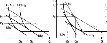 Фирма, действующая в отрасли, благодаря относительному преимуществу в издержках, может назначить такую цену, что для новой фирмы вход окажется бессмысленным. Она назначает ограничивающую вход цену Р' и ограничивающий вход объем продаж Q' таким образом, чтобы при данном остаточном спросе новая фирма не могла получить прибыль ни при каком объеме выпуска. Рассмотрим, например, цену P1 и объем продаж Q1.Видно, что новая фирма при такой комбинации цены и выпуска (равно как и при другой доступной ей комбинации) будет нести убытки. Следовательно, она лишена стимулов выхода на рынок. Обратим внимание, что эта модель предусматривает, что скорость входа новой фирмы на рынок не очень высока, так что фирма, традиционно действующая в отрасли, успевает назначить ограничивающую вход цену. Если бы новая фирма могла войти в отрасль мгновенно, ничто не препятствовало бы ей поменяться местами со старой фирмой, назначить еще более низкую цену, так что выйти из отрасли пришлось бы старой фирме. Хотя эта возможность ничего не меняет с точки зрения результатов модели: в отрасли остается только один производитель. Уровень ограничивающей вход цены зависит от величины превышения цены над уровнем издержек при минимально эффективном выпуске, что определяется соотношением МЭВ к размеру рынка и эластичностью спроса по цене. Чем больше уровень МЭВ по отношению к размеру рынка и чем меньше эластичность спроса, тем больше возможности для отклонения цены от уровня издержек, тем выше возможности проводить политику ограничивающего вход ценообразования. Пусть долгосрочные средние издержки старой и новой фирм одинаковы (рис 4.7, кривая LRAC). Минимально эффективный объем выпуска равен Q1. Зная, что потенциальный конкурент в случае входа произведет Q1 объем выпуска, старая фирма может произвести Q2 количества товара, больше, чем МЭВ, но меньше конкурентного уровня Qc, уровня, когда фирма не получает прибыли (Р=АС). Этот объем выпуска будет продаваться по цене P2>P1, и старая фирма будет получать прибыль. Однако новой фирме будет невыгодно входить отрасль, несмотря на наличие положительной прибыли, так как произведя Q1 при том, что старая фирма производит Q2, новая фирма в случае входа резко увеличит объем совокупного предложения, понизив цену в отрасли ниже уровня долгосрочных средних издержек. Поскольку потенциальный конкурент обладает информацией о параметрах экономического процесса, он не будет входить на рынок при цене Р2, эта цена (при объеме выпуска Q2) будет для него ограничивающей вход. Очевидно, чем меньше уровень МЭВ, тем больше ограничивающий вход выпуск старых фирм (величина Q2), тем ниже будет цена Р2 (см. рис. 4.7а). С другой стороны, чем ниже эластичность спроса по цене, тем выше будет уровень ограничивающей вход цены при данном Q2, и тем выше будут барьеры для входа (см. рис. 4.76). Несмотря на кажущуюся простоту ценообразования, ограничивающего вход, его применение на практике ставит перед фирмами ряд проблем, которые снижают эффективность этой политики как метода установления барьеров входа:
