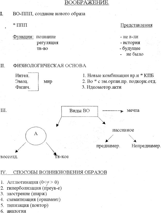 II. Воображение - это процесс создание новых образов, на основе комбинации, преобразовании ранее воспринимавшихся образов. С точки зрения физиологии - это процесс образования новых сочетаний, комбинаций из уже имеющихся в коре головного мозга нервных связей. Процесс воображения связан с эмоциональной сферой, психофизиологическими состояниями организма, органическими процессами /ритм дыхания, сердцебиение, потоотделение, температурный баланс организма и т.д./. Известны также идеомоторные акты - движения вызванные воображением /мысленно представляешь качание маятника в руке, и он действительно начинает раскачиваться/. Это дает основание считать, что центры воображения находятся не только в коре головного мозга, но и в более глубоко залегающих отделах, подкорке - гипотоламолимбической системе.