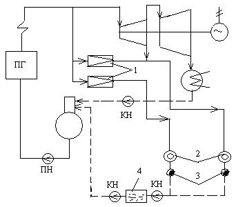 Рис. 9.1.2. Двухтрубная система пароснабжения от ТЭЦ: 1 – РОУ на ТЭЦ, 2 – потребители пара, 3 – конденсатоотводчики, 4 – сборник конденсата