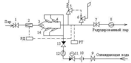 Рис. 9.1.3. Схема редукционно-охладительной установки: 1 и 7 – запорные задвижки, 2 – клапан дроссельный, 3 – шумоглушитель, 4 – форсунка, 5 – импульсный клапан, 6 – главный предохранительный клапан, 8 и 12 – измерительные диафрагмы, 9 – запорный клапан, 10 – ограничительная дроссельная шайба, 11 – регулирующий клапан впрыска, 13 – обратный клапан, 14 – коллектор пароохладителя, РТ – регулятор температуры пара, РД – регулятор давления