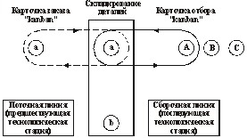 Рис. 6.7. движение карточек «kanban»: A, B, C – продукция; a, b – детали