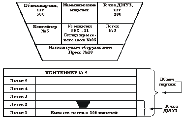 Наглядно точка Q ДМУЗ может быть отображена на сигнальной карточке «kanban», используемой на фирме «Тойота» для описания партии заготовок, поступающих из заготовительных цехов на участки механической обработки (рис. 6.9). Приведенная на рис. 6.9 треугольная сигнальная карточка «kanban» означает заказ на изготовление панелей для 500 левых автомобильных дверей на прессе № 10 после того, как все панели, кроме лежащих на двух нижних лотках контейнеров № 5, будут использованы. Таким образом, заказ возобновляется, когда остается два нижних лотка или 200 панелей. Поэтому сигнальная карточка прикреплена к лотку № 2. График производства фактически формируется обращением карточек «kanban», так как они составляют заказ на изготовление новых деталей. -