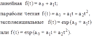 где f(t)- уровень, определяемый тенденцией развития; et - случайное и циклическое отклонение от тенденции. Целью аналитического выравнивания динамического ряда является определение аналитической или графической зависимости f(t). На практике по имеющемуся временному ряду задают вид и находят параметры функции f(t), а затем анализируют поведение отклонений от тенденции. Функцию f(t) выбирают таким образом, чтобы она давала содержательное объяснение изучаемого процесса. Чаще всего при выравнивании используются следующие зависимости: