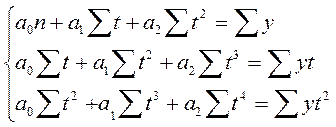При аналитическом выравнивании по параболе система уравнений для определения ее параметров примет следующий вид: