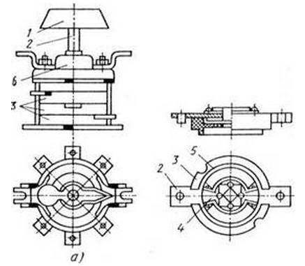 Вопрос № 23 Пакетные переключатели. Для коммутации нескольких цепей при нескольких фиксированных положениях для выбора различных режимов работы используются пакетные переключатели. Такой переключатель (рис а) состоит из ряда слоев — пакетов 3 (показан отдельно на рис б), внутри которых находятся подвижный 5 и неподвижный 4 контакты. Подвижный контакт 5 закреплен на оси 2, вращающейся с помощью рукоятки 1 и имеющей ряд фиксированных положений, и которых замыкаются неподвижные контакты одного из пакетов. Выводы 6 неподвижных контактов закреплены в корпусе переключателя. Пакетные переключатели кулачкового типа, в которых электрическая цепь замыкается неподвижными контактами, более надежны. Подвижными у них являются диэлектрические кулачки, которые и замыкают контакты в зависимости от профиля кулачка и положения оси. Конструкции пакетных переключателей, предназначенных для цепей управления, позволяют получить десятки и сотни вариантом разнообразных схем соединений при числе коммутируемых цепей до 24 (12 пакетов) и количестве фиксированных положений до X (через 45, 60 или 90°).