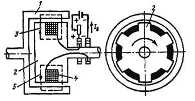 Вопрос №42 Вопрос №41 Электромагнитные индукционные муфты. Индукционные муфты (рисунок 11.1) по принципу действия аналогичны асинхронному двигателю с коротко замкнутым ротором. Приводной двигатель соединяется со сплошным якорем 1, ведомый вал связан с индуктором 2. Катушка возбуждения 4 создает постоянный магнитный поток 5, замыкающийся по якорю 1. При вращении якоря магнитное поле катушки индуктора пересекает цилиндрическое тело якоря, и в нем наводятся вихревые токи. Взаимодействие этих токов с магнитным полем создает силу, которая увлекает индуктор в направлении вращения якоря. Материал якоря должен обладать малым удельным электрическим сопротивлением, что обеспечивает возникновение достаточно больших вихревых токов, и высокой магнитной проницаемостью для получения возможно больших значений магнитного потока.