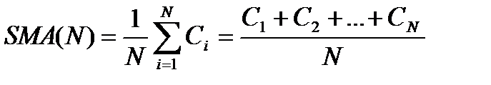 Индикатор – это производная цены, высчитанная по определенным параметрам. Индикаторы существуют двух видов: · Трендовые индикаторы · Осцилляторы Трендовые индикаторы Тренд - это устойчивое направление движения цены. Трендовые индикаторы созданы для того, чтобы идентифицировать эту тенденцию. Приведем несколько примеров индикаторов: Простое скользящее среднее (simple moving average, SМА). Для расчета SMA сумму цен закрытия делят на количество периодов, взятых для расчета индикатора. При каждом добавлении новой цены, старая цена исключается из рассматриваемого диапазона, сохраняя тем самым заданное количество периодов. Формула для расчета SMA имеет следующий вид: