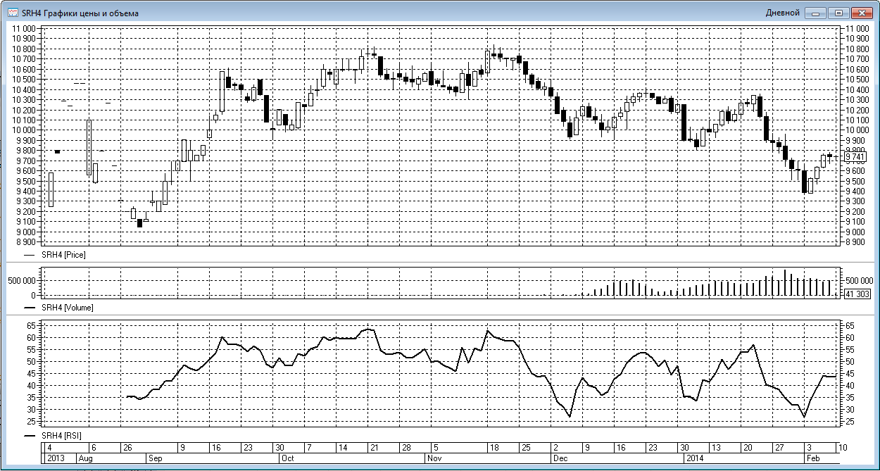 Рисунок №.Пример индикатора RSI нанесенного на график цены.