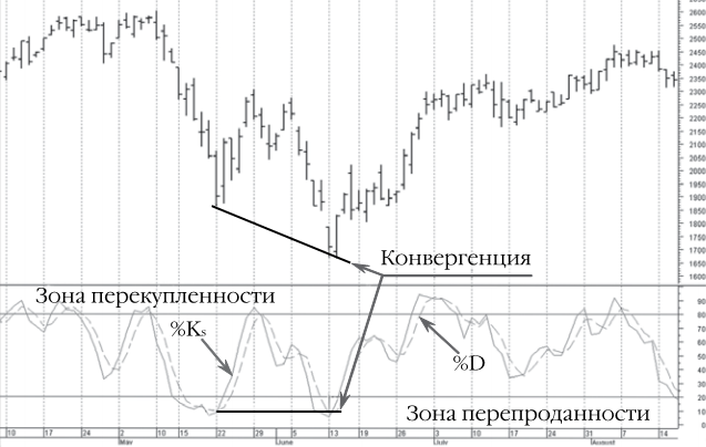 Рисунок №. Пример конвегенции между ценой и стохастическим осциллятором.