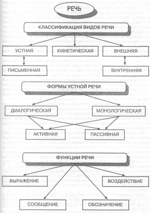 Рис. 13.3. Общая характеристика речи определенное сходство. Оно заключается в том, что в современных языках письменная речь, как и устная, является звуковой: знаки письменной речи выражают не непосредственное значение, а передают звуковой состав слов. Основным исходным видом устной речи является речь, протекающая в форме разговора. Такую речь называют разговорной, или диалогической (диалоговой). Ее главная особенность состоит в том, что она является речью, активно поддерживаемой собеседником, т. е. в процессе разговора участвуют двое, используя простейшие обороты языка и фразы. Вследствие этого разговорная речь в психологическом плане является наиболее простой формой речи. Она не требует развернутого выражения речи, поскольку собеседник в процессе разговора хорошо понимает то, о чем идет речь, и может мысленно достроить фразу, произнесенную другим собеседником. В подобных случаях одно слово может заменять собой целую фразу. Другую форму речи представляет собой речь, произносимая одним человеком, в то время как слушатели только воспринимают речь говорящего, но прямо в ней не участвуют. Такую речь называют монологической, или монологом. Монологической речью является, например, речь оратора, лектора, докладчика и др. Монологическая речь психологически более сложна, чем диалогическая. Она требует от говорящего умения связно, строго последовательно излагать свои мысли. При этом говорящий должен оценивать то, как усваивается передаваемая им информация слушателями, т. е. он должен следить не только за своей речью, но и за аудиторией. Характеризуя эти два вида устной речи — речь диалогическую и монологическую, — надо иметь в виду не их внешнее, а психологическое различие. По своей внешней форме эти два вида речи могут быть похожи друг на друга. Так, например, монолог может быть построен по своей внешней форме как диалогическая речь, т. е. говорящий обращается периодически или к слушателям, или к воображаемому оппоненту. Как диалогическая, так и монологическая речь может быть активной или пассивной. Оба эти термина, конечно, условны и характеризуют деятельность говорящего или слушающего человека. Активная форма речи — это речь говорящего человека, речь же слушающего человека выступает в пассивной форме. Дело в том, что когда мы слушаем, мы повторяем про себя слова говорящего. При этом внешне это не проявляется, хотя речевая деятельность присутствует. Следует отметить, что у детей развитие активной и пассивной формы речи происходит не одновременно. Ребенок прежде всего учится понимать чужую речь, а потом начинает говорить сам. Однако и в более зрелом возрасте люди различаются по степени развития активной и пассивной форм речи. Очень часто бывает так, что человек хорошо понимает речь другого человека, но плохо передает свои собственные мысли. И наоборот, человек может достаточно хорошо говорить, но совершенно не умеет слушать другого. Другим видом речи является письменная речь. Письменная речь отличается от устной не только тем, что она изображается графически, с помощью письменных знаков. Между данными видами речи существуют и более сложные, психологические различия. Одно из важнейших отличий устной речи от письменной заключается в том, что в устной речи слова строго следуют одно за другим, так что когда звучит одно слово, предше