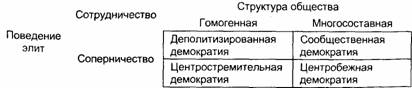 Источник: Лейпхарт А. Демократия в многосоставных обществах: сравнительное исследование. М., 1997. С. 143. 184Глава 9. Политические режимы концепции Лейпхарта, в переходном состоянии от центробежного к центростремительному.