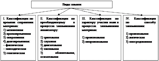 1ч 9ч 24ч 48ч Схема 8 Мотивация влияет на избирательность памяти, сохраняя в ней следы незавершенных заданий. Это явление носит название эффект Зейгарник – способность человека непроизвольно удерживать в своей памяти и в первую очередь воспроизводить то, что отвечает его наиболее актуальным, но не вполне удовлетворенным потребностям. Если людям предложить серию заданий и одни из них позволить довести до конца, а другие прервать незавершенными, то оказывается, что впоследствии испытуемые почти в два раза чаще вспоминают незавершенные задания, чем завершенные к моменту прерывания. 5. Генетическая память – вид памяти, позволяющий хранить информацию в генотипе, передавая и воспроизводя ее по наследству. У человека данный вид памяти слабо выражен. Генетическая память человека – единственный вид памяти, на который невозможно оказывать влияние через обучение. II. Классификация памяти по преобладающему в процессах запоминания, сохранения и воспроизведения анализатору: 1. Зрительная память – память, связанная с сохранением и воспроизведением зрительных образов. Хорошей зрительной памятью обладают люди с развитым воображением. То, что человек зрительно может себе представить, как правило, легче запоминается и воспроизводится. 2. Слуховая память – это память, связанная с запоминанием и точным воспроизведением различных звуков (музыкальных, речевых). Особую разновидность слуховой памяти составляет словесно-логическая память, которая выражается в запоминании и воспроизведении мыслей. При этом словесно-логическая память проявляется в двух случаях: а) запоминается и воспроизводится только смысл данного материала, а точное сохранение подлинных выражений не требуется; б) запоминается не только смысл, но и буквальное словесное выражение мыслей. 3. Двигательная память – это память, связанная с запоминанием и сохранением, а при необходимости и воспроизведением с достаточной точностью многообразных сложных движений. Данный вид памяти участвует в формировании спортивных, художественных, трудовых умений и навыков. 4. Эмоциональная память – память, заключающаяся в способности запоминать и воспроизводить чувства и переживания. Эмоциональная память участвует в работе всех видов памяти, особенно проявляясь в человеческих отношениях. На эмоциональной памяти непосредственно основана прочность запоминания информации: то, что у человека вызывает эмоциональное переживание, запоминается им без труда и на длительный срок. В соответствии с тем, какие сенсорные области доминируют у человека в процессах запоминания и воспроизведения информации, выделяют индивидуальный тип памяти: зрительную, слуховую, двигательную, эмоциональную и разнообразные их сочетания. «Чистые» типы памяти, в смысле безусловного доминирования одного из перечисленных, крайне редки. Наибольшего развития у человека достигают те типы памяти, которые чаще всего им используются в профессиональной деятельности. III. Классификация памяти по характеру участия воли в процессах запоминания, сохранения и воспроизведения материала: 1. Произвольная память – память, предполагающая постановку задачи на запоминание, узнавание, сохранение или воспроизведение, а сам процесс запоминания или воспроизведения требует волевых усилий. 2. Непроизвольная память – память, предполагающ