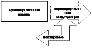 Схема 7 Долговременная память обычно начинает функционировать не сразу после того как человек воспринял и запомнил данный материал, а спустя некоторое время, необходимое для того, чтобы человек внутренне смог переключиться с процесса запоминания на процесс воспроизведения. Это свойство долговременной памяти называется реминисценцией – улучшением со временем воспроизведения заученного материала без дополнительных повторений. Обычно реминисценция происходит на второй, третий день после заучивания материала. Забывание (невозможно восстановить ранее вопринятую информацию) протекает во времени неправомерно. Опыты Г. Эббингауза показали, что наибольшая потеря информации происходит сразу же после ее получения, а в дальнейшем забывание идет медленнее (схема 8).