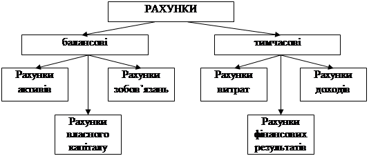Для єдності змісту економічної інформації про активи, зобов'язання і капітал, а також для правильної і чіткої побудови і організації бухгалтерського обліку необхідні систематизований перелік і конкретна характеристика кожного рахунку. Таким важливим нормативним документом, що регламентує єдність методології бухгалтерського обліку, є План рахунків бухгалтерського обліку активів, капіталу, зобов'язань і господарських операцій підприємств і організацій, затверджений наказом МФУ від 30 листопада 1999 року. Він є обов'язковим для всіх підприємств і організацій України (окрім банків і бюджетних установ). План рахунків – це систематизований перелік рахунків, що визначає організацію всієї системи бухгалтерського обліку на підприємстві з метою отримання інформації для управління і контролю. План рахунків розроблений на основі класифікації рахунків за їх економічним змісту, згідно якої всі рахунки згруповані в 9 класів (балансові рахунки). В окремий клас виділені забалансові рахунки. В основі побудови Плану рахунків лежить дворядна система, яка передбачає виділення двох автономних систем рахунків відповідно до цілей фінансового й управлінського обліку. Згідно з цим, усі рахунки чітко поділяють на балансові та тимчасові, що подано на рис.5.