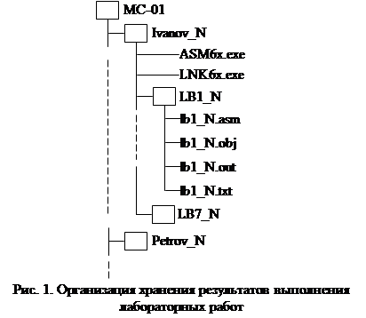На любом доступном диске создать рабочую папку группы с соответствующим именем, например МС-01, в котором используются только латинские буквы. Для удобства хранения результатов выполнения лабораторных работ в папке группы (например, МС-01) создать дерево папок (рис. 1), где имена папок и содержащиеся в них файлы включают номер студента в списке группы (обозначен символом N) и прописываются только латинскими буквами. В дальнейшем N используется в качестве номера варианта задания. С целью удобства работы с симулятором команд из папки С:\C6XTOOLS\CODEGEN.110\BIN скопировать в рабочую папку студента <Папка группы>\<Familiy_N> файлы ASM6x.exe и LNK6x.exe (см. рис. 1). При выполнении текущей лабораторной работы все необходимые файлы сначала размещаются в рабочей папке < Familiy_N>, а после завершения отладки перемещаются в папку соответствующей лабораторной работы (LB<№ работы>_N).