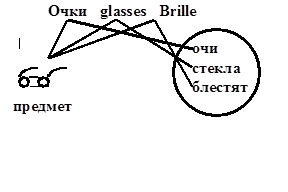 Первая лексическая трудность перевода заключается в различии признаков, определяющих происхождение слова в различных языках (рис. 1). Например, происхождение англ. “glasses”, рус. “очки” и нем. “Brille” основано на разных признаках одного и того же понятия (рис.2).