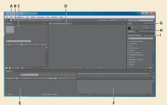 A. Application window B. Tools panel C. Project panel D. Composition panel E. Timeline panel F. Time graph G. Grouped panels (Info and Audio) H. Preview panel I. Effects & Presets panel You customize a workspace by dragging the panels into the configuration that best suits your working style. You can drag panels to new locations, move panels into or out of a group, place panels alongside each other, and undock a panel so that it floats in a new window above the application window. As you rearrange panels, the other panels resize automatically to fit the window. When you drag a panel by its tab to relocate it, the area where you can drop it—called a drop zone —becomes highlighted. The drop zone determines where and how the panel is inserted into the workspace. Dragging a panel to a drop zone either docks it or groups it. If you drop a panel along the edge of another panel, group, or window, it will dock next to the existing group, resizing all groups to accommodate the new panel. If you drop a panel in the middle of another panel or group, or along the tab area of a panel, it will be added to the existing group and be placed at the top of the stack. Grouping a panel does not resize other groups. You can also open a panel in a floating window. To do so, select the panel and then choose Undock Panel or Undock Frame from the panel menu. Or, drag the panel or group outside the application window. When you begin a project, often the first thing you’ll do is add footage to it. 3 Choose File > Import > File. 4 Navigate to the Assets folder in your AECS5_CIB/Lessons/Lesson01 folder. Shift-click to select the dancers.mov, gc_adobe_dance.mp3, kaleidoscope_ waveforms.mov, and pulsating_radial_waves.mov files (all the files except bgwtext.psd). Then click Open. _ Tip: To quickly maximize a panel, position the pointer over it and press the accent grave (`) key— the unshifted character under the tilde (~) on standard US keyboards. Press the ` key again to return the panel to its original size. A footage item is the basic unit in an After Effects project. You can import many types of footage items, including moving-image files, still-image files, still-image sequences, audio files, layered files from Adobe Photoshop and Adobe Illustrator, other After Effects projects, and projects created in Adobe Premiere Pro. You can import footage items at any time. As you import assets, After Effects reports its progress in the Info panel. Because one of the footage items for this project is a multilayer Photoshop file, you’ll import it separately as a composition. 5 Double-click in the lower area of the Project panel to open the Import File dialog box. _ Tip: You can also choose File > Import > Multiple Files to select files located in different folders, or drag and drop files from Explorer or the Finder. You can use Adobe Bridge to search for, manage, preview, and import footage.