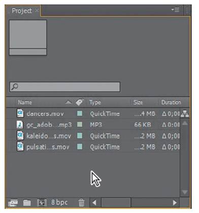 8 In the Project panel, click to select different footage items. Notice that a thumbnail preview appears at the top of the Project panel. You can also see the file type and size, as well as other information about each item, in the Project panel columns.