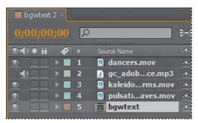 Layers are the components you use to build a composition. Any item that you add to a composition—such as a still image, moving-image file, audio file, light layer, camera layer, or even another composition—becomes a new layer. Without layers, a composition consists only of an empty frame. Using layers, you can work with specific footage items in a composition without affecting any other footage. For example, you can move, rotate, and draw masks for one layer without disturbing any other layers in the composition, or you can use the same footage in more than one layer and use it differently in each instance. In general, the layer order in the Timeline panel corresponds to the stacking order in the Composition panel. In this composition, there are five footage items, and therefore five layers in the Timeline panel. Depending on the order in which the elements were selected when you imported them, your layer stack may differ from the one shown on the previous page. The layers need to be in a specific order as you add effects and animations, however, so you’ll rearrange them now. 6 Click an empty area of the Timeline panel to deselect the layers, and then drag bgwtext to the bottom of the layer stack if it is not already there. Drag the other four layers so that they’re in the order shown in the figure. _ Note: You may need to click a blank area of the Timeline panel or press F2 to deselect layers before you can select an individual layer.