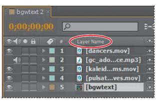 From this point forward in the workflow, you should be thinking about layers, not footage items. You’ll change the column title accordingly. 7 Click the Source Name column title in the Timeline panel to change it to Layer Name. 8 Choose File > Save to save your project so far.
