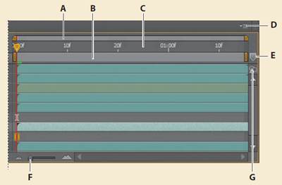 A. Time navigator start and end brackets B. Work area start and end brackets C. Time ruler D. Timeline panel menu E. Composition marker bin F. Time zoom slider G. Composition button Before delving too deeply into animation, it will help to understand at least some of these controls. The duration of a composition, a layer, or a footage item is represented visually in the time graph. On the time ruler, the current-time indicator marks the frame you are viewing or editing, and the frame appears in the Composition panel. The work area start and end brackets indicate the part of the composition that will be rendered for previews or final output. When you work on a composition, you may want to render only a portion of it by specifying a segment of the composition time ruler as a work area. A composition’s current time appears in the upper-left corner of the Timeline panel. To move to a different time, drag the current-time indicator in the time ruler or click the current-time field in the Timeline panel or Composition panel, type a new time, and click OK. For more information about the Timeline panel, see After Effects Help.