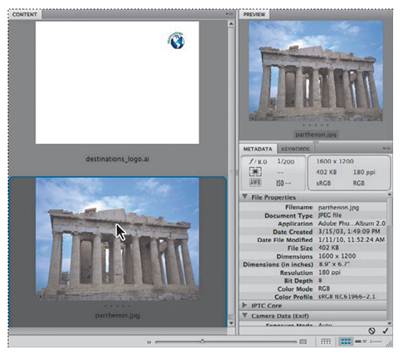 _ Tip: To prioritize different information in Adobe Bridge, change the workspace: choose Window > Workspace, and then select a workspace. See Adobe Bridge Help to learn about customizing Adobe Bridge. 5 Select the parthenon.jpg file in the Content panel, and notice that it appears in the Preview panel as well. Information about the file, including its creation date, bit depth, and file size, appears in the Metadata panel.