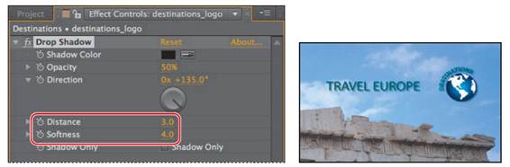 2 Choose Effect > Perspective > Drop Shadow. A soft-edged shadow appears behind the nested layers of the destinations_logo layer—the logo graphic, the rotated type, and the words travel Europe —in the Composition panel.