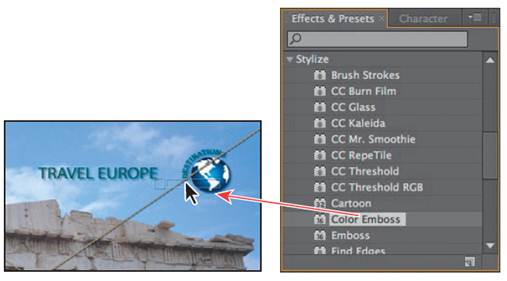 The drop shadow is nice, but the logo will stand out even more if you apply an emboss effect. You can use either the Effect menu or the Effects & Presets panel to locate and apply effects. 4 Click the Effects & Presets tab to bring that panel forward. Then click the triangle next to Stylize to expand the category. 5 With the destinations_logo layer selected in the Timeline panel, drag the Color Emboss effect into the Composition panel. The Color Emboss effect sharpens the edges of objects in the layer without suppressing the original colors. The Effect Controls panel displays the Color Emboss effect and its settings below the Drop Shadow effect.
