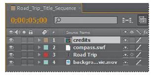 Because you imported the credits.psd file as a composition with layers intact, you can work on it in its own Timeline panel, editing and animating its layers independently.