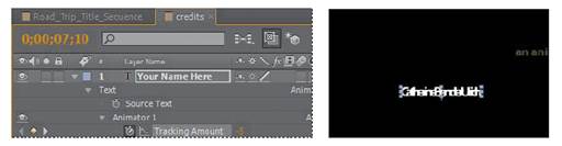 Customizing the tracking animation preset The text expands, but you want the letters to be so close initially that they’re on top of each other, and then to expand to a reasonable, readable distance apart. The animation should also occur faster. You’ll adjust the Tracking Amount to achieve both goals. 1 Select the Your Name Here layer in the Timeline panel, and press UU to reveal the properties that were modified. 2 Go to 7:10. 3 Under Animator 1, change the Tracking Amount to -5 so that the letters are squeezed together.