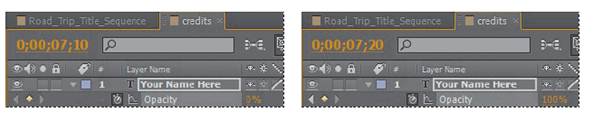 5 Drag the current-time indicator across the time ruler between 7:10 and 8:10. The letters expand as they appear onscreen, and stop animating at the last keyframe. You’ll take the animation of the director’s name a little further by having it fade onscreen as the letters expand. To do this, you’ll animate the layer’s Opacity property. 1 Select the Your Name Here layer in the Credits timeline. 2 Press T to reveal only the layer’s Opacity property. 3 Go to 7:10, and set the Opacity to 0%. Then click the stopwatch icon () to set an Opacity keyframe. 4 Go to 7:20, and set the Opacity to 100%. After Effects adds a second keyframe. Now, the letters of the director’s name should fade in as they expand onscreen.