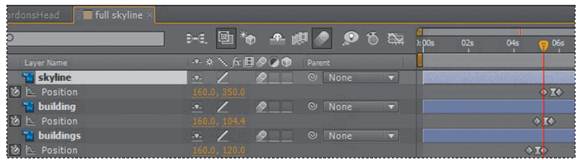 2 Drag the current-time indicator from 4:20 to 5:10 to preview the jumping building. To animate the other layers in the full skyline composition, you’ll copy and paste the buildings layer’s keyframes to those other layers—but at different times—so that the elements jump in sequence. 1 Click the Position property name for the buildings layer to select all of the property’s keyframes, and then choose Edit > Copy or press Ctrl+C (Windows) or Command+C (Mac OS). 2 Go to 5:00, and select the building layer in the Timeline panel. Choose Edit > Paste or press Ctrl+V (Windows) or Command+V (Mac OS) to paste the keyframes to this layer. (You won’t see the pasted keyframes if the Positionproperty isn’t visible.) 3 Go to 5:10, and select the skyline layer. Choose Edit > Paste or press Ctrl+V (Windows) or Command+V (Mac OS) again to paste the keyframes to this layer, too. 4 Select the building layer name, and press the P key to see the copied keyframes. Do the same for the skyline layer. 5 Apply motion blur to all three layers, and then switch to the CarRide Timeline panel, and turn on motion blur for the full skyline precomposed layer. This applies motion blur to all of the nested layers. You’ve done a lot of work. Take a look at the animation from the beginning.