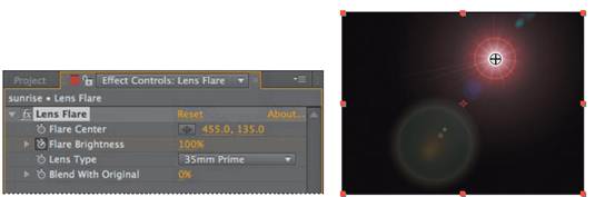 4 Click OK to create the Lens Flare layer. 5 With the Lens Flare layer selected in the Sunrise Timeline panel, choose Effect > Generate > Lens Flare. The Composition panel and the Effect Controls panel display the visual andnumeric default Lens Flare settings, respectively; you’ll customize the effect for this composition. 6 Drag the Flare Center cross-hair icon () in the Composition panel to the center of the sun. You cannot see the sun in the Composition panel; the x, y coordinates, which you can read in the Effect Controls or Info panel, are approximately 455, 135. _ Tip: You can also enter the Flare Center values directly in the Effect Controls panel. 7 In the Effect Controls panel, change the Lens Type to 35mm Prime, a more diffuse flare effect.