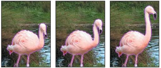 You used the Roto Brush tool to create a base frame, which includes a segmentation boundary that divides the foreground from the background. After Effects applied the segmentation boundary across a span of frames. The Roto Brush span appears below the time ruler at the bottom of the Layer panel. As you move forward andbackward through the footage, the segmentation boundary moves with the foreground object (in this case, the flamingo). You’ll step through the frames in the span and adjust the segmentation boundary as necessary. _ Tip: To move forward one frame, press the 2 key on your keyboard; to move back one frame, press the 1 key. 1 Press the 2 key to move forward one frame. Based on the base frame, After Effects tracks the edge of the object and attempts to follow its movement. Depending on how complex your foreground and background elements are, the boundary may or may not conform exactly to the area you hoped it would. In this case, you may notice changes to the segmentation boundary along the breast of the bird, near the feet, the tail feathers, or where the neck and body meet. This is normal, but it means you need to refine the segmentation. _ Note: As it propagates the segmentation boundary for a frame, After Effects caches that frame. Cached frames have a green bar in thetime ruler. If you jump ahead to a frame further along the span, After Effects may take longer to process it. 2 Using the Roto Brush tool, paint foreground and background strokes to refine the matte for this frame. If the matte is accurate, you needn’t paint any strokes. As you move through the span, each change you make affects the frames after it. The more you refine your selection, the better the overall results will be. 3 Press the 2 key again to move forward to the next frame. 4 Use the Roto Brush tool to add foreground and background strokes as necessary to refine the segmentation boundary. 5 Repeat steps 3 and 4 until you reach 1:20. If the span doesn’t increase automatically, drag it forward to extend it beyond the initial 20 frames.