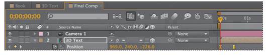 You’ve animated objects in earlier lessons, but 3D objects can be animated across the x, y, and z axes. You’ll animate the 3D Text layer to make the composition more dynamic. 1 Click the Final Comp tab in the Timeline panel if it’s not already active. 2 Move the current-time indicator to 0:15. 3 Select the 3D Text layer in the Timeline panel, and press the P key to reveal the Position property for the layer. 4 Click the stopwatch icon next to the Position property to set an initial keyframe for the layer.