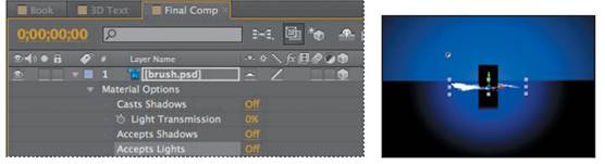 Adding effects After Effects provides many options for special effects that you can use with either 2D or 3D scenes. You’ll add a few animated brush strokes to this scene to give it more drama and flair. The Material Options properties determine how 3D layers interact with lights and shadows. You’ll add a layer that won’t be affected by the lights you added earlier. 1 Press the Home key, or move the current-time indicator to the beginning of the time ruler. 2 Click the Project tab. Then drag the brush.psd item from the Project panel into the Timeline panel, and place it at the top of the layer stack. 3 Select the 3D Layer switch () for the brush.psd layer to convert it to a 3D layer. The layer jumps to the center of the composition, but you can no longer see it, because the brush.psd layer is affected by the lights in the scene. 4 Select the brush.psd layer in the Timeline panel, and press AA to reveal the Material Options properties for the layer. 5 Click the value for the Accepts Shadows property (currently On) to change it to Off. 6 Click the value for the Accepts Lights property (currently On) to change it to Off.