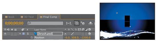 7 Press the P key to display the Position property for the brush.psd layer, and then change the Position value to -6, 308, -2200. The layer moves very close to the camera.