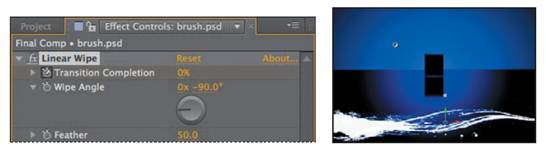 Currently, the brush stroke is present throughout the composition. You’ll add a transition effect to change the way the brush stroke arrives on the scene. 1 With the brush.psd layer selected, choose Effect > Transition > Linear Wipe. 2 In the Effect Controls panel, change Transition Completion to 100%, Wipe Angle to -90 degrees, and Feather to 50. 3 In the Effect Controls panel, click the stopwatch icon for the Transition Completion property to create an initial keyframe.