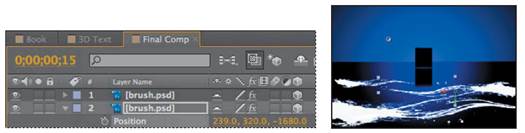 14 With the middle brush.psd layer selected, press Ctrl+D (Windows) or Command+D (Mac OS) to duplicate it. 15 Move the newest duplicate layer to the top of the layer stack. 16 With the top layer selected, press the P key to reveal the Position layer. Then change the position to 840, 360, -400.