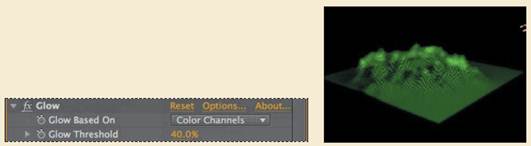 As the movie plays, the layer will spin in space. In order to displace this layer, you’ll need to add another layer. _ Tip: You can use any grayscale image to displace a layer in After Eff ects. For example, you could use text, satellite imaging, or displacement maps you create in Adobe Photoshop. 6 In the Timeline panel, press U, select the Rotation Z property to select both of its keyframes, and then right-click or Control-click one of the keyframes and choose Keyframe Assistant > Easy Ease. 7 Drag the Map.tif item from the Project panel into the Timeline panel, placing it at the bottom of the layer stack. Then click the Video switch for the layer to hide it. 8 Select the Island layer in the Timeline panel, and bring the Effect Controls panel to the front. Expand the Displacement Controls. Then choose 2. map.tif from the Displace Layer menu. 9 Press the Home key, or move the current-time indicator to the beginning of the time ruler, and create an initial keyframe for Displace Height, with a value of 0. 10 Go to 1:00. Then change the Displace Height value to 200. You have an island, but it looks like something from the early days of computer graphics. You can refine the look. 11 In the Effect Controls panel, expand the 3D Mesh Quality properties. Change the Mesh Subdivision value to 75, choose High from the Antialiasing menu, and then choose On from the Image Filtering menu. Because you’re working in three dimensions, you can add lights to cast shadows and create a glow.