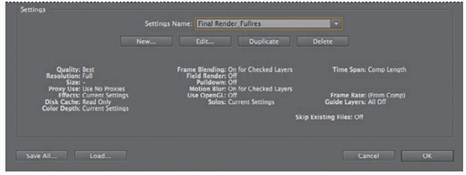 Final Render_Fullres is now the default Render Settings option, and will appear (instead of Current Settings) when you add a composition to the Render Queue panel to make a movie, which you’ll do later in this lesson. _ Tip: If you want to save a render-settings template for use on another system, click Save All in the Render Settings Templates dialog box before you close it in step 7. Save the file with an.ars extension, and copy it to the other system. There, choose Edit > Templates > Render Settings, click Load, and select the.ars file to load the settings you saved.
