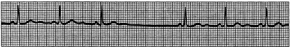 Рис. 183-5. Синоатриальный блок на выходе II степени. На поверхностной ЭКГ выявляют внезапное исчезновение зубца Р на фоне синусового ритма. До возникновения паузы синусовый ритм правильный. Продолжительность паузы соответствует продолжительности двух исходных синусовых циклов.