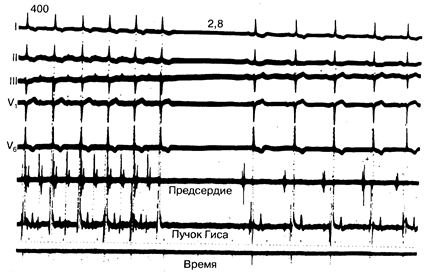 Рис. 183-6. Пример развития эпизода восстановления синусно-предсердного узла у больного с симптомами его дисфункции. Прекращение стимуляции предсердий с ритмом 150 ударов в минуту (продолжительность цикла 400 мс) приводит к продолжительной синусовой паузе. На данном рисунке поверхностные ЭКГ, зарегистрированные в I, II, III, V1 и V6 отведениях, сопоставляются с внутрисердечными электрограммами, снятыми в верхней части правого предсердия и на уровне предсердно-желудочкового пучка (Гиса).