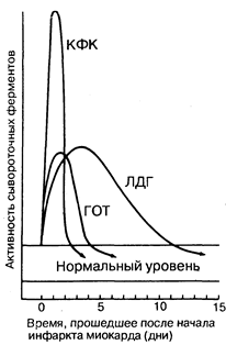 Некротизированная во время острого инфаркта миокарда сердечная мышца выделяет в кровь большое количество ферментов. Скорость выброса различных специфических ферментов неодинакова. Изменение уровня ферментов в крови во времени имеет большую диагностическую ценность. Динамика концентрации ферментов, наиболее часто используемых для диагностики острого инфаркта миокарда, показана на рис. 190-1. Уровень двух ферментов, сывороточной глутаматоксалоацетаттрансаминазы (СГОТ) и креатинфосфокиназы (КФК) возрастает и снижается очень быстро, в то время как уровень лактатдегидрогеназы (ЛДГ) нарастает медленнее и дольше остается повышенным. Недостаток определения СГОТ заключается в том, что этот фермент содержится также в скелетных мышцах, в клетках печени, эритроцитах и может высвобождаться из этих экстракардиальных источников. Поэтому в настоящее время определение СГОТ для диагностики острого инфаркта миокарда используют реже, чем раньше, вследствие неспецифичности этого фермента и того, что динамика его концентрации занимает промежуточное положение между динамикой концентрации КФК и динамикой концентрации ЛДГ, в связи с чем информация об уровне СГОТ становится в большинстве случаев излишней. Определение содержания MB изофермента КФК имеет преимущества перед определением концентрации СГОТ, поскольку этот изофермент практически не определяется в экстракардиальной ткани и поэтому более специфичен, чем СГОТ. Поскольку подъем концентрации КФК или СГОТ определяется в течение короткого времени, он может оставаться незамеченным в тех случаях, когда образцы крови берут более чем через 48 ч после развития инфаркта миокарда. Определение MB—КФК имеет практический смысл в тех случаях, когда есть подозрение на повреждение скелетных мышц или ткани мозга, поскольку в них содержатся значительные количества этого фермента, но не его изофермента. Специфичность MB-изофермента для определения повреждения миокарда зависит от используемой методики. Наиболее специфичен радиоиммуноанализ, однако на практике тем не менее чаще используют электрофорез в геле, обладающий меньшей специфичностью и поэтому чаще дающий ложноположительные результаты. При остром инфаркте миокарда уровень ЛДГ повышается в первый же день, между 3-м и 4-м днем он достигает пика и в среднем через 14 дней возвращается к норме. При проведении электрофореза в крахмальном геле можно выделить пять изоферментов ЛДГ. Разные ткани содержат различные количества этих изоферментов. Изофермент, обладающий наибольшей электрофоретической подвижностью, в основном содержится в миокарде, его обозначают как ЛДГ). Изоферменты, обладающие наименьшей электрофоретической подвижностью, содержатся преимущественно в скелетной мускулатуре и в клетках печени. При остром инфаркте миокарда уровень ЛДГ1 повышается еще до того, как повышается уровень общей ЛДГ, т. е. может наблюдаться повышение содержания ЛДГ) при нормальном содержании общей ЛДГ. Следовательно, выявление повышенного уровня ЛДГ| является более чувствительным диагностическим тестом при остром инфаркте миокарда, чем уровень общей ЛДГ, его чувствительность превышает 95 %.