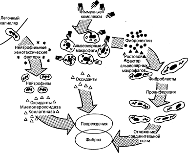 Различают два основных механизма повреждающего действия клеток воспаления на альвеолы. Первый заключается в том, что клетки воспаления аккумулируются на ограниченных участках альвеолярной стенки, а это приводит к ее повреждению и нарушениям процесса газообмена. Второй предполагает выделение воспалительными клетками большого числа медиаторов, повреждающих клетки паренхимы и соединительнотканный матрикс, стимулирующих пролиферацию фибробластов, что и приводит к формированию легочного фиброза (рис. 209-3). В норме в одной альвеоле содержится около 60 альвеолярных макрофагов и 15 лимфоцитов, тогда как полиморфно-клеточные лейкоциты, как правило, не обнаруживаются. При развитии же воспаления (в случае интерстициальных заболеваний легких неясной этиологии) происходят следующие морфологические изменения: 1) значительно увеличивается число клеток воспаления в респираторных отделах легких; 2) изменяется соотношение воспалительных клеточных элементов — для одних заболеваний характерно преобладание лимфоцитов, в других случаях доминируют нейтрофилы, альвеолярные макрофаги и/или эозинофилы; 3) повышается функциональная активность клеток воспаления. Последние активируются под воздействием целого ряда медиаторов, которые в свою очередь оказывают повреждающее действие на альвеолярные структуры. Так, некоторые медиаторы инициируют процесс образования токсичных кислородных радикалов, которые вызывают повреждение клеток паренхимы; высвобождающиеся при этом внутриклеточные протеазы обусловливают дезорганизацию соединительнотканного матрикса легких. Легочный фиброз развивается вследствие высвобождения альвеолярными макрофагами медиаторных субстанций, инициирующих пролиферацию фибробластов. Эти медиаторы, включая фибронектин и ростовой фактор альвеолярных макрофагов, способствуют перемещению фибробластов в интерстиций. В результате резко увеличивается число фибробластов, «продуцирующих» соединительную ткань, что и приводит к формированию пневмофиброза.