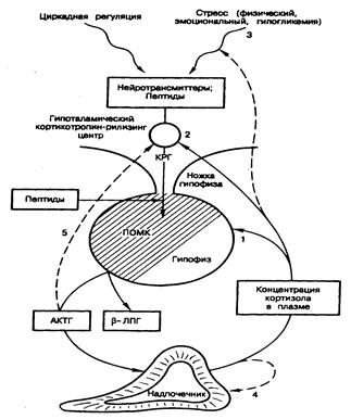 в ходе секреторного процесса. Однако уровни b-эндорфина при определенных стимулах могут меняться независимо от уровней АКТГ в крови. Функция и регуляция секреции родственных АКТГ пептидов, образующихся из ПОМК, остаются неясными. К основным факторам, контролирующим секрецию АКТГ, относятся КРГ, концентрация свободного кортизола в плазме, стресс и цикл сон—бодрствование (рис. см. 325-4). В течение дня уровень АКТГ в плазме меняется вследствие его импульсной секреции, но в целом существует суточная периодичность с максимумом тотчас перед пробуждением и минимумом незадолго до отхода ко сну. При изменении цикла сон—бодрствование характер секреции АКТГ уже через несколько дней приобретает соответствие новому циклу. Уровни АКТГ и кортизола возрастают также после еды. Стресс (например, введение пирогенов, хирургическая операция, гипогликемия, физическая нагрузка и тяжелые эмоциональные переживания) в свою очередь повышает секрецию АКТГ. Связанная со стрессом секреция АКТГ нарушает суточную периодичность продуцирования гормона, но и сама снимается предварительным введением больших доз глюкокортикоидов. Секреция АКТГ при стрессе и нормальная импульсная и ритмическая его секреция регулируются КРГ; это так называемая открытая петля механизма обратной связи. На секрецию КРГ в свою очередь влияют гипоталамические нейротрансмиттеры. Например, серотонинергическая и холинергическая системы стимулируют секрецию КРГ и АКТГ; относительно игибиторных влияний a-адренергических агонистов и гамма-аминомасляной кислоты (ГАМК) на секрецию КРГ данные противоречивы. Кроме того, может иметь место и непосредственное действие этих нейротрансмиттеров на гипофиз. Имеются также данные о пептидергической регуляции секреции АКТГ. Например, бета-эндорфин и энкефалин тормозят, а вазопрессин и ангиотензин II усиливают секрецию АКТГ. Наконец, секрецию АКТГ регулирует уровень свободного кортизола в плазме. Кортизол снижает чувствительность кортикотрофов гипофиза к КРГ, т. е. в присутствии кортизола нужно большее количество КРГ, чтобы вызвать данный прирост секреции АКТГ. Глюкокортикоиды ингибируют и секрецию КРГ. Этот сервомеханизм демонстрирует ведущую роль концентрации кортизола в крови в регуляции секреции АКТГ. Ингибирование продукции АКТГ протекает в две фазы: 1) ранняя быстрая отрицательная обратная связь опосредуется, вероятно, мембранным эффектом, сохраняется меньше 10 мин и зависит от скорости повышения уровня глюкокортикоидов; и 2) зависимая от времени поздняя реакция по механизму обратной связи обусловливается, по-видимому, торможением синтеза белка-предшественника. Торможение секреции АКТГ, приводящее к атрофии надпочечников при длительной терапии глюкокортикоидами, может быть связано в основном с подавлением секреции КРГ на уровне гипоталамуса, поскольку в таких условиях экзогенное введение КРГ продолжает вызывать подъем уровня АКТГ в плазме. Кортизол влияет по механизму обратной связи и на вышележащие центры головного мозга (гиппокамп, ретикулярную систему и перегородку), а также, вероятно, на саму кору надпочечников (см. рис. 325-4). Биологический период полужизни АКТГ в крови не достигает и 10 мин. Действие АКТГ также проявляется быстро; концентрация стероидов в венозной крови надпочечников возрастает уже через нескольк
